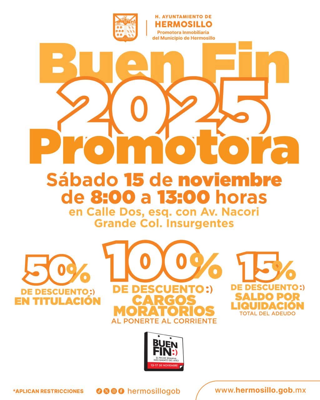 Hermosillo, Sonora; 13 de noviembre, 2025.-* Como parte de las promociones del Buen Fin que el Gobierno Municipal ofrece, Promotora Inmobiliaria del Municipio de Hermosillo ofrecerá atractivos descuentos este sábado 15 de noviembre de 8 de la mañana a 1 de la tarde.