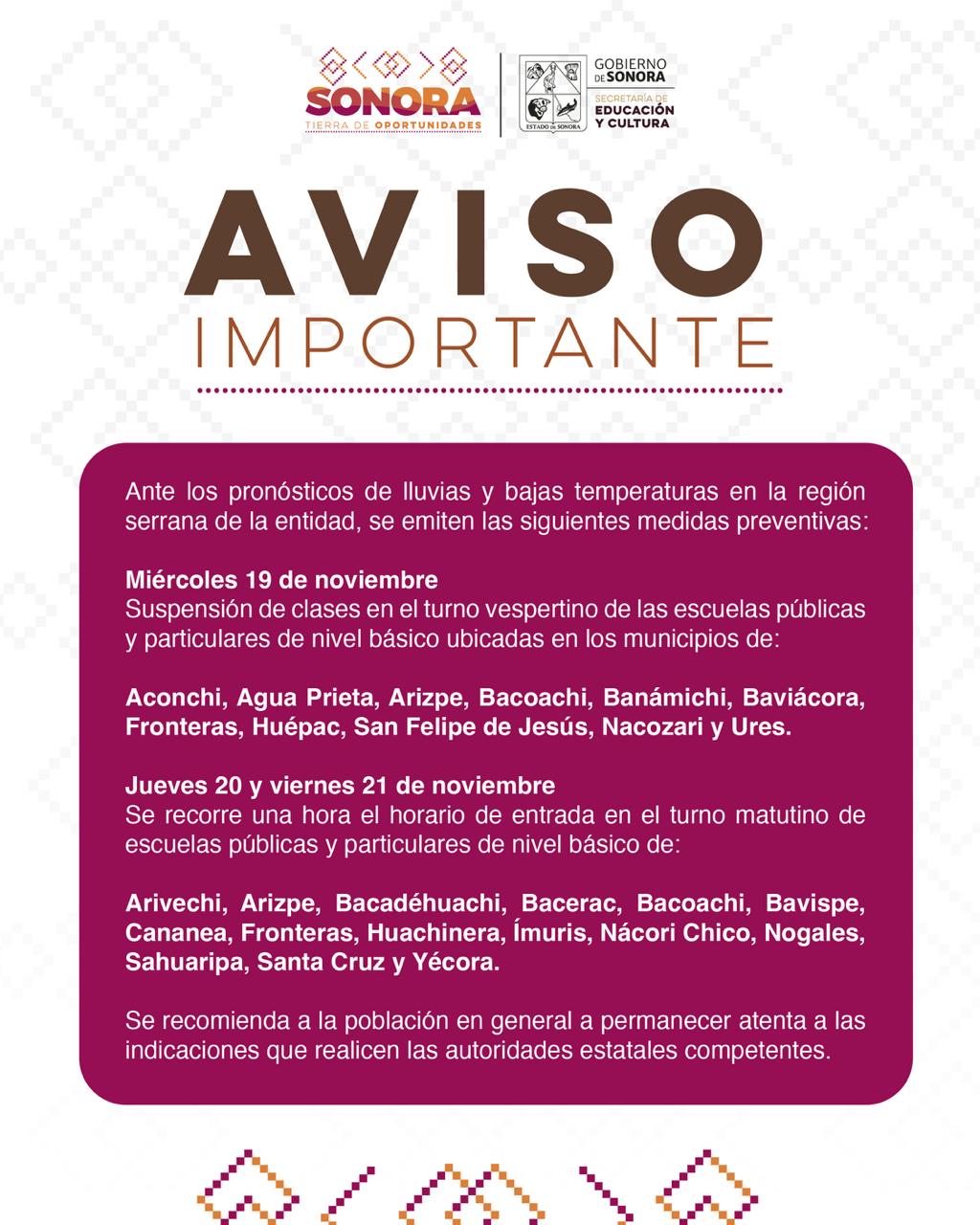 Hermosillo, Sonora; 19 de noviembre 2025*.- La Secretaría de Educación y Cultura (SEC) informa que se suspenden clases en el turno vespertino de las escuelas públicas y particulares de nivel básico ubicadas en los municipios de Aconchi, Agua Prieta, Arizpe, Bacoachi, Banámichi, Baviácora, Fronteras, Huépac, San Felipe de Jesús, Nacozari y Ures.