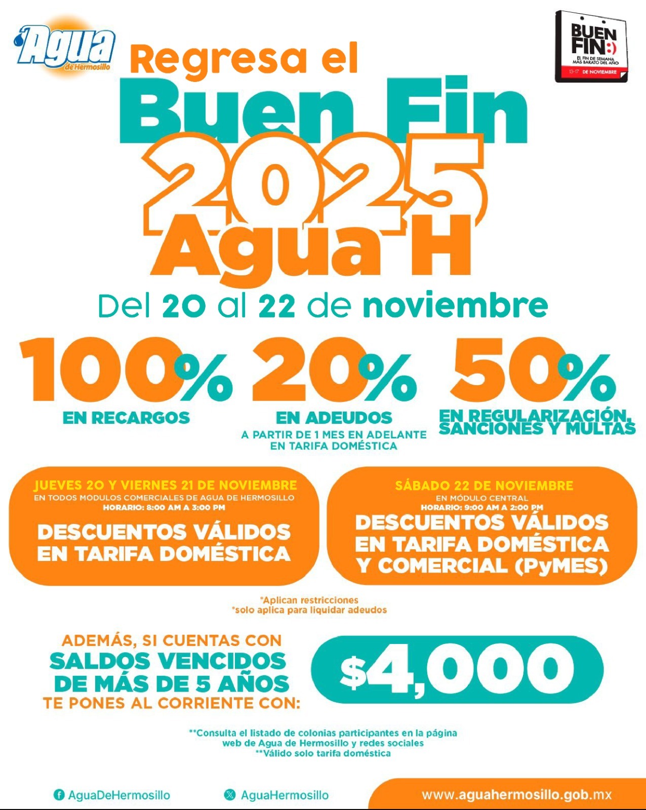Hermosillo, Sonora; 20 de noviembre, 2025.-* Como parte de las promociones que Agua de Hermosillo ofrece para usuarias y usuarios que deseen ponerse al corriente, el organismo operador anunció el regreso del Buen Fin del 20 al 22 de noviembre con atractivos descuentos.