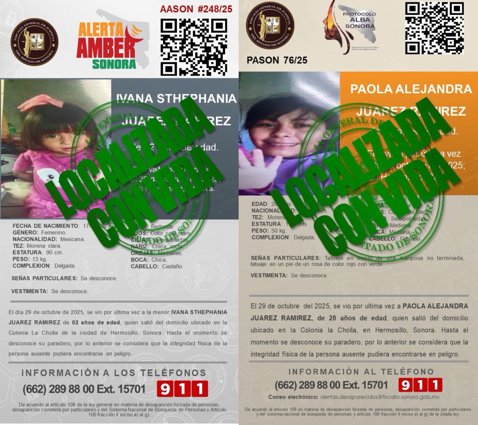 Hermosillo, Sonora, 25 de noviembre de 2025.-* La Fiscalía General de Justicia del Estado de Sonora (FGJES), en coordinación con la Policía Estatal de Seguridad Pública localizó sanas y salvas a Paola Alejandra “N” y su hija de 2 años de edad, quienes eran buscadas tras un reporte de desaparición en la colonia La Cholla de Hermosillo.