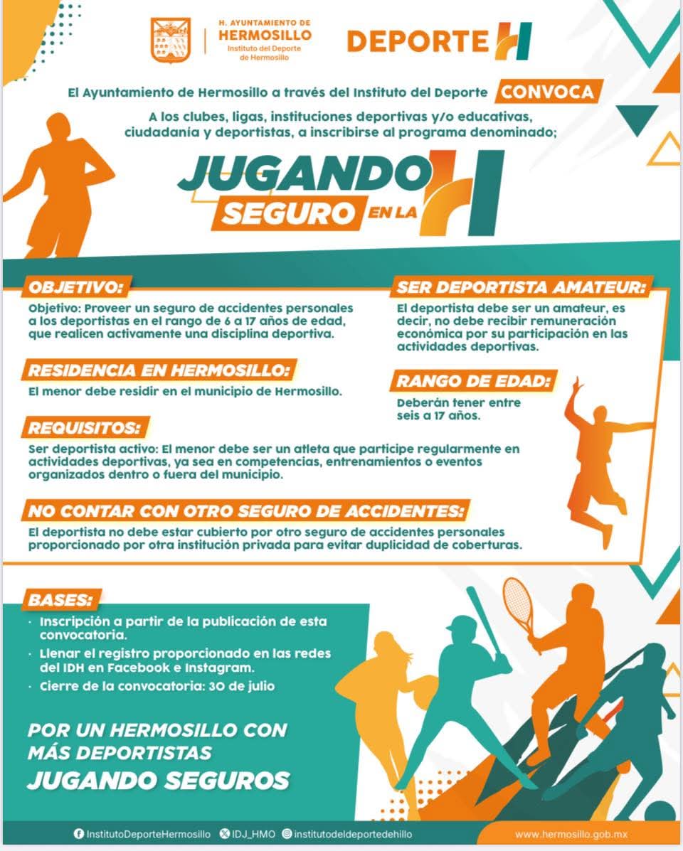Rafael Cruz Flores, director del Instituto del Deporte de Hermosillo (IDH), invitó a registrarse en la liga https://rebrand.ly/Juega-Seguro para formar parte de esta iniciativa impulsada por el presidente municipal Antonio Astiazarán que busca otorgar un seguro de gastos médicos a 2 mil 500 jóvenes deportistas.