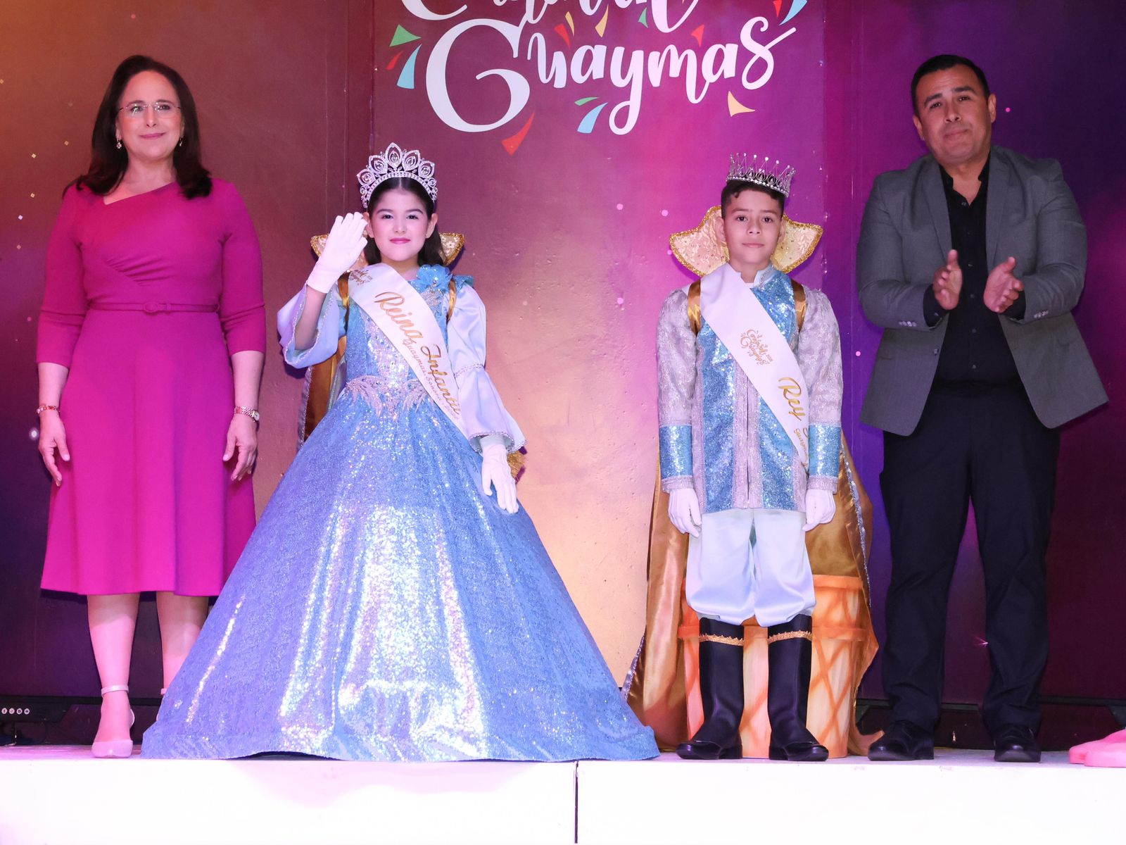Como resultado, fueron coronados como reyes infantiles del Carnaval Guaymas 2026 los niños Gabriela Sofía y Moisés Ubaldo y fue la presidenta municipal, doctora Karla Córdova González y Jesús Córdova, presidente del patronato del DIF Guaymas, los encargados de imponerles la banda correspondiente.