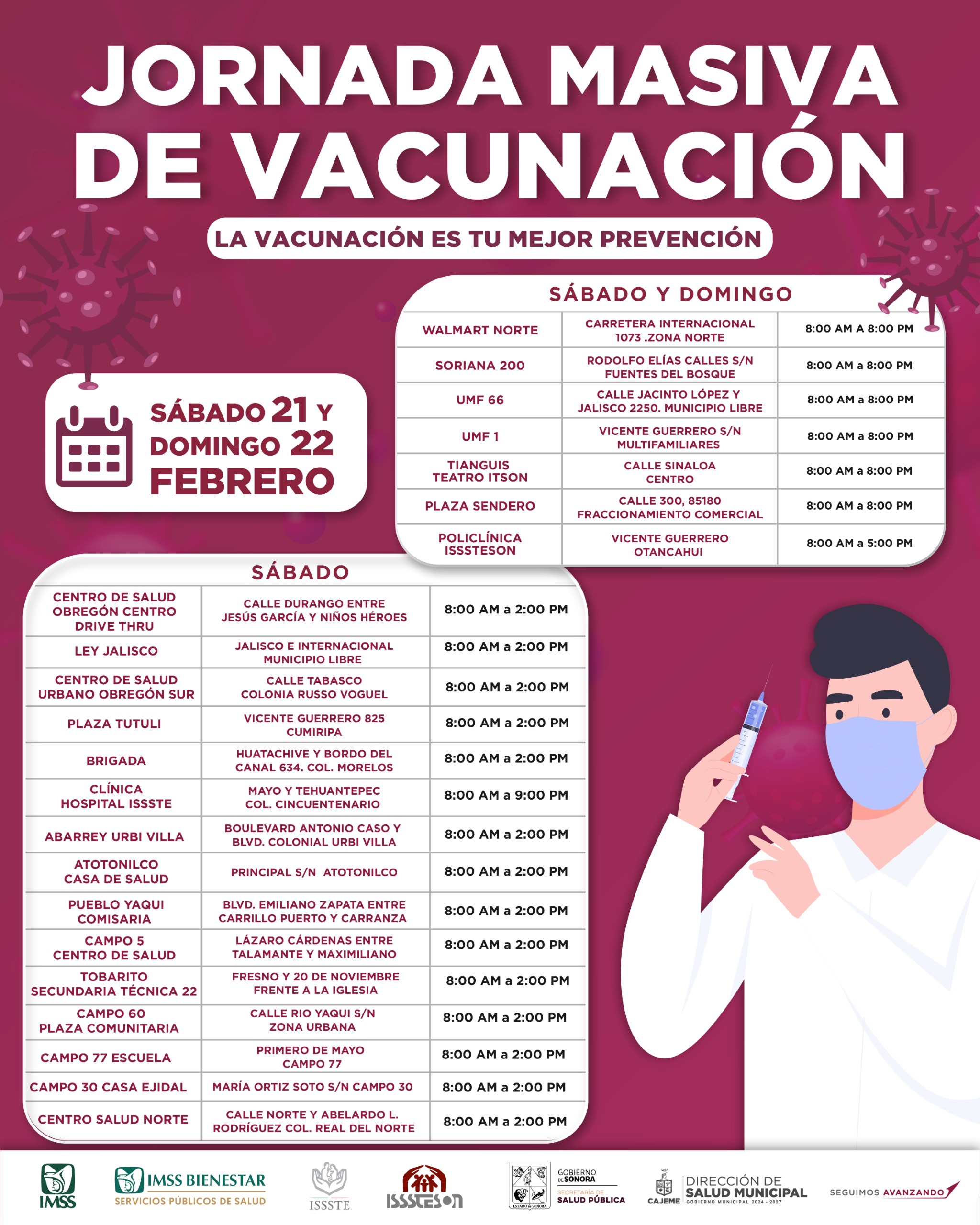 El día sábado 21 de febrero se brindarán servicios en un horario de 8:00 de la mañana a 2:00 de la tarde, en los módulos situados en el Centro de Salud Obregón Centro (Drive Thru); Ley Jalisco; Centro de Salud Urbano Obregón Sur; Plaza Tutuli; Brigada (Huatabampo y bordo del canal 634, Col. Morelos); Clínica Hospital ISSSTE; Abarrey Urbi Villa; Atotonilco (Casa de Salud); Pueblo Yaqui (Comisaría); Campo 5 (Centro de Salud); Marte R. Gómez y Tobarito (Secundaria Técnica 22); Campo 60 (Plaza Comunitaria); Campo 77 (Escuela); Campo 30 (Casa Ejidal) y en el Centro de Salud Norte.