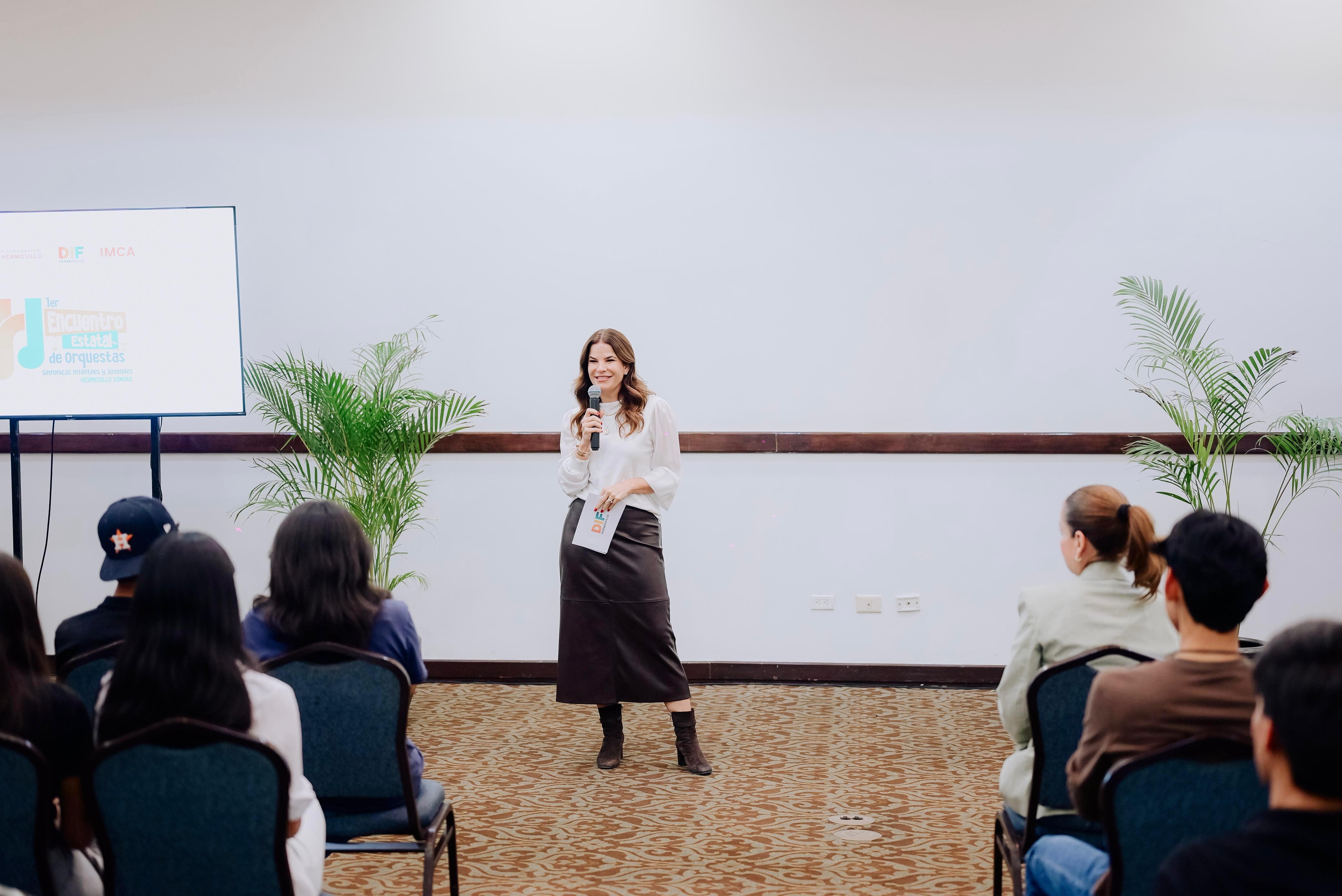 Madeleine Bonnafoux Alcaraz, directora de DIF Hermosillo, felicitó a las y los jóvenes músicos al recordar que los participantes han colaborado con artistas de talla internacional como Carín León o han tocado para el Papa Francisco en el Vaticano, por mencionar algunos, experiencias que compartirán en este encuentro.