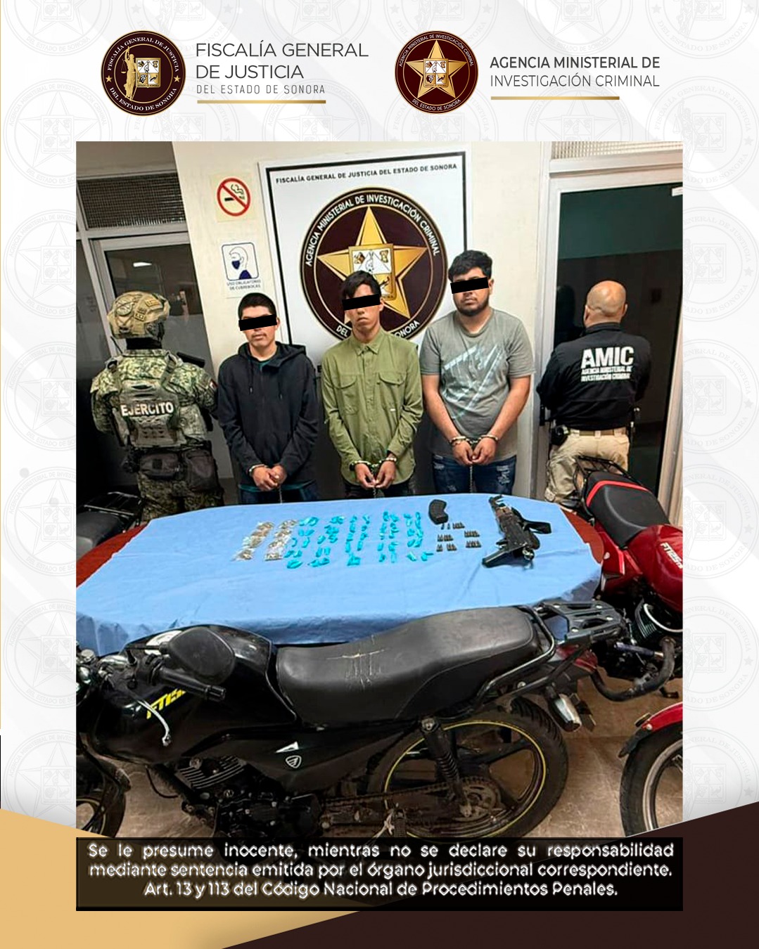 Cajeme, Sonora, 21 de febrero de 2026.- La Fiscalía General de Justicia del Estado de Sonora (FGJES), en coordinación con elementos de la Agencia Ministerial de Investigación Criminal (AMIC) y la Secretaría de la Defensa Nacional (DEFENSA), ejecutó un operativo conjunto que derivó en la detención de tres sujetos en posesión de drogas, un arma de fuego de uso exclusivo de las Fuerzas Armadas y un vehículo con reporte de robo vigente en Cajeme.