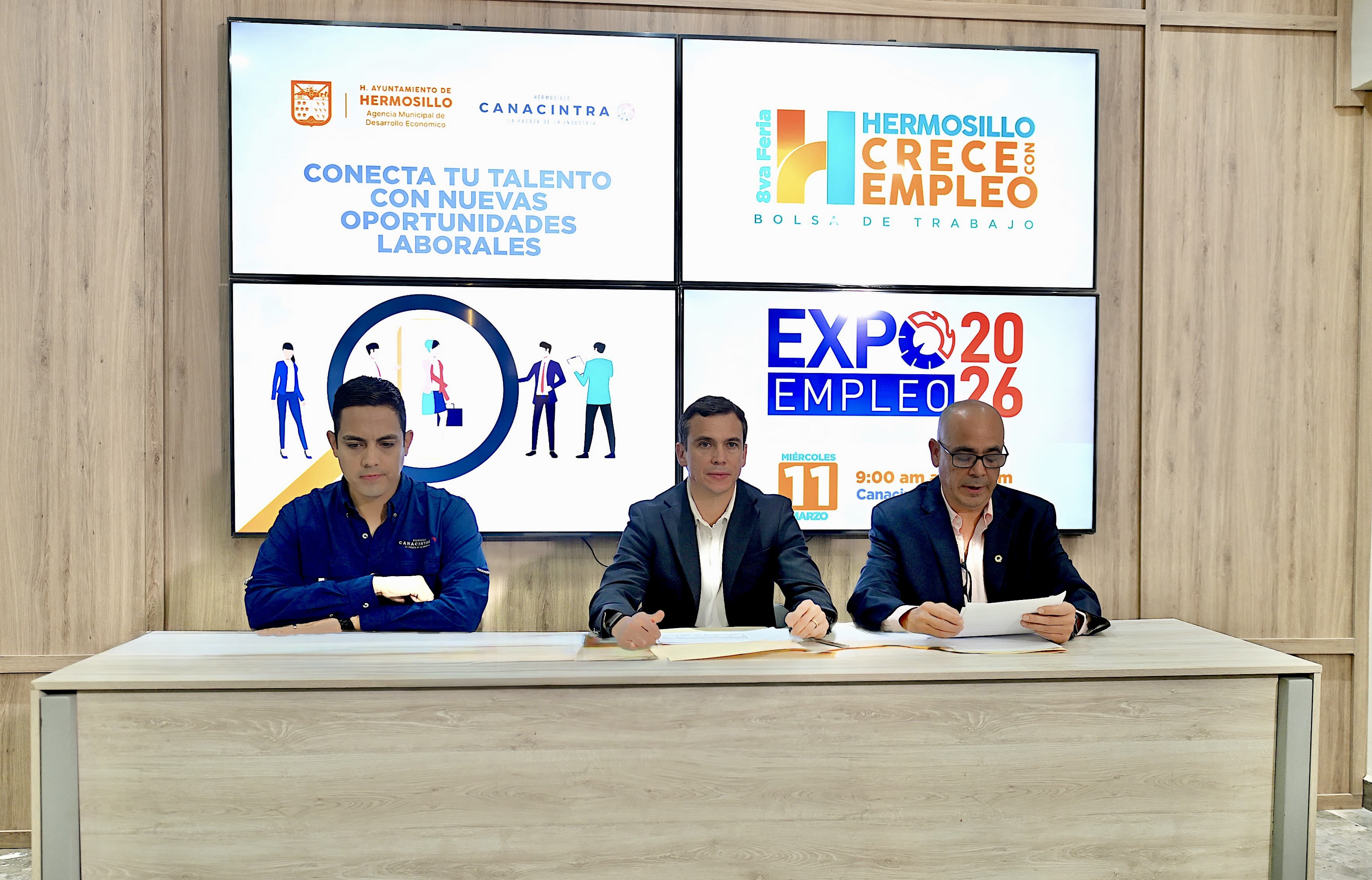 El director de la Agencia Municipal de Desarrollo Económico (AMDE) compartió detalles del evento junto con Iván Contreras Tapia y José Jesús Aguiar Varela, presidente y director de Canacintra Hermosillo, respectivamente, quienes confirmaron como sede las instalaciones del organismo empresarial, en Luis Encinas 460 de la colonia Los Naranjos, de las 9:00 a las 14:00 horas.