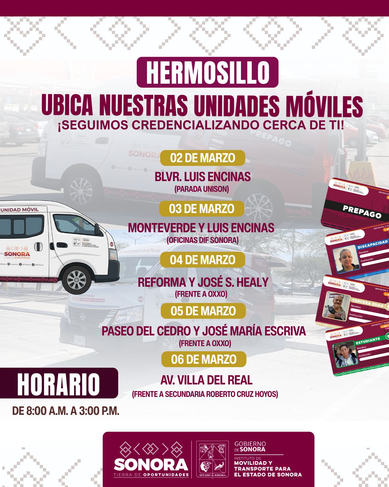 Hermosillo, Sonora; 28 de febrero de 2026.– El Instituto de Movilidad y Transporte para el Estado de Sonora (IMTES), informa que las Unidades Móviles continúan credencializando sin costo a las personas usuarias del transporte urbano en Hermosillo.