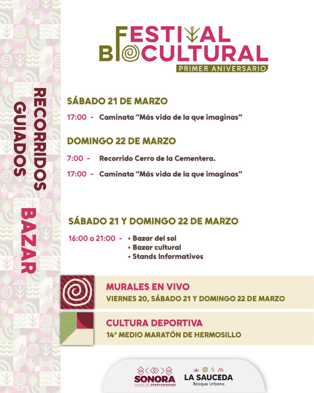 Hermosillo, Sonora; 5 de marzo de 2026.- El Gobierno de Sonora invita a las familias sonorenses a celebrar el primer aniversario del Bosque Urbano La Sauceda con el Festival Biocultural, que se realizará los días 20, 21 y 22 de marzo, con más de 60 actividades gratuitas entre eventos musicales, culturales, talleres, charlas, recorridos y experiencias educativas para todas las edades.