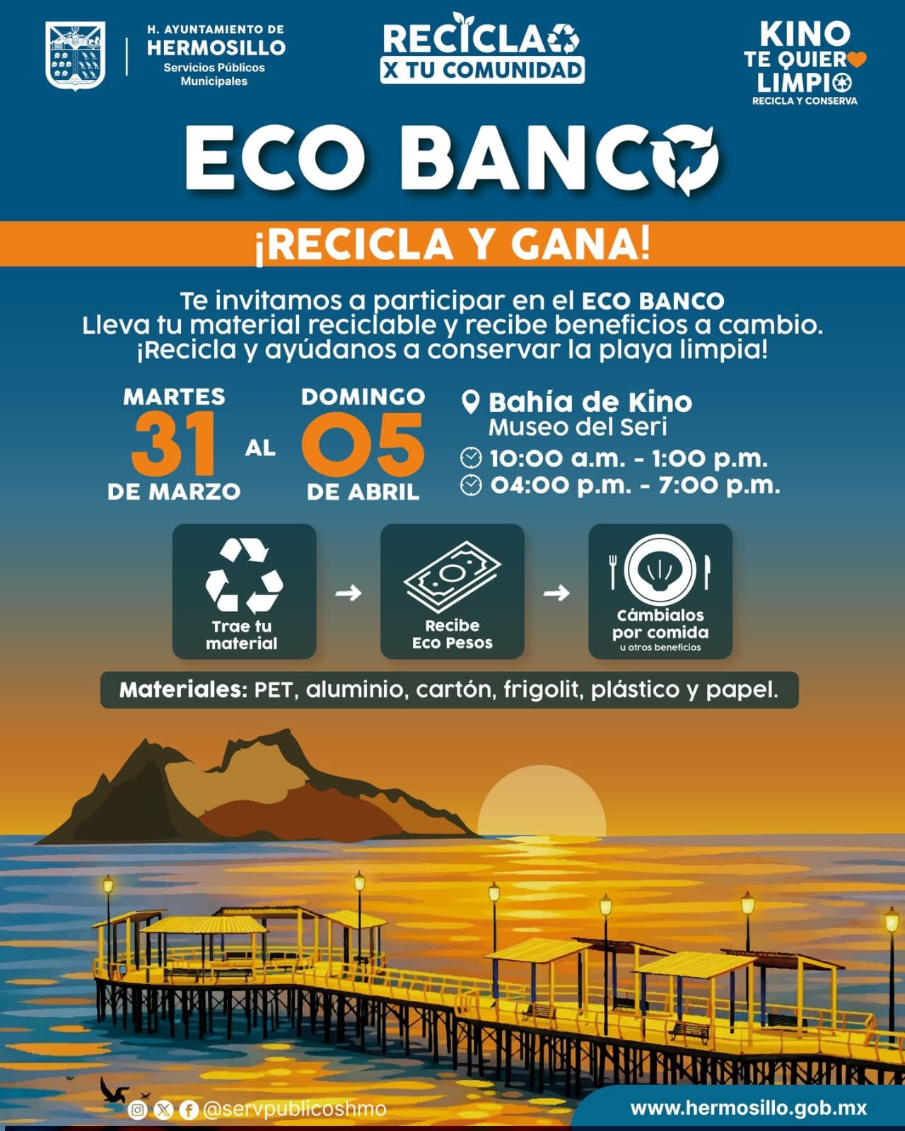 Hermosillo, Sonora; 1 de abril, 2026.-* Esta Semana Santa las y los vacacionistas pueden contribuir al medio ambiente con el Eco Banco, en el que pueden canjear material reciclable por comidas en negocios participantes en Bahía de Kino, informó Sergio Pavlovich Escalante, director de Servicios Públicos Municipales.