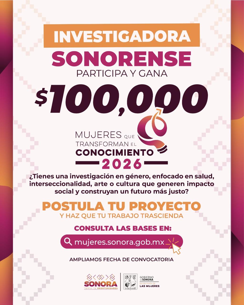 Hermosillo, Sonora; 14 de abril de 2026.— El Gobierno de Sonora a través de la Secretaría de las Mujeres amplía el plazo de registro y entrega de investigaciones del Primer Premio Estatal: Mujeres que transforman el conocimiento, hasta el primero de mayo de 2026.
