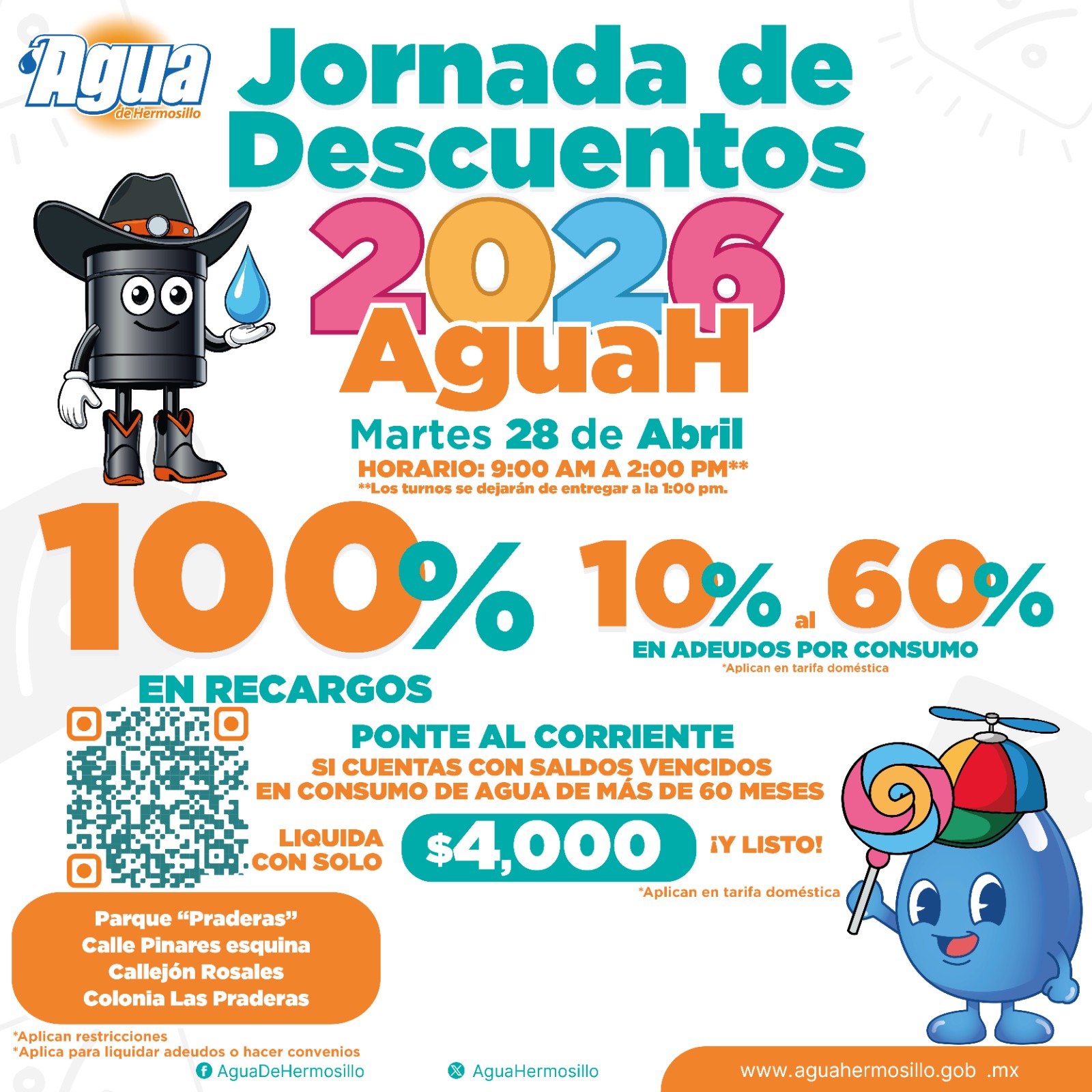 Hermosillo, Sonora; 25 de abril, 2026.-* Personas con adeudos en el servicio de agua potable tendrán la oportunidad de regularizar su situación durante la Jornada de Descuentos 2026 de Agua de Hermosillo que se llevará a cabo el próximo martes 28 de abril en el parque “Praderas”, ubicado en la colonia Las Praderas.