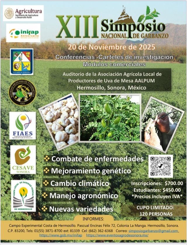 Hermosillo, Sonora; 18 de noviembre de 2025.– Con el propósito de impulsar la innovación tecnológica en el cultivo de garbanzo, la Secretaría de Agricultura, Ganadería, Recursos Hidráulicos, Pesca y Acuacultura (Sagarhpa), coordina con el Inifap la realización del XIII Simposio Nacional de Garbanzo, a efectuarse este 20 de noviembre a las 9:00 horas en el auditorio de la Asociación de Productores de Uva de Mesa en Hermosillo.