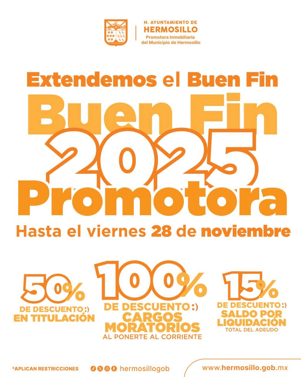Hermosillo, Sonora; 19 de noviembre, 2025.-* En apoyo a las familias hermosillenses, el Gobierno Municipal a través de Promotora Inmobiliaria del Municipio de Hermosillo extiende hasta el viernes 28 de noviembre los descuentos del Buen Fin 2025.