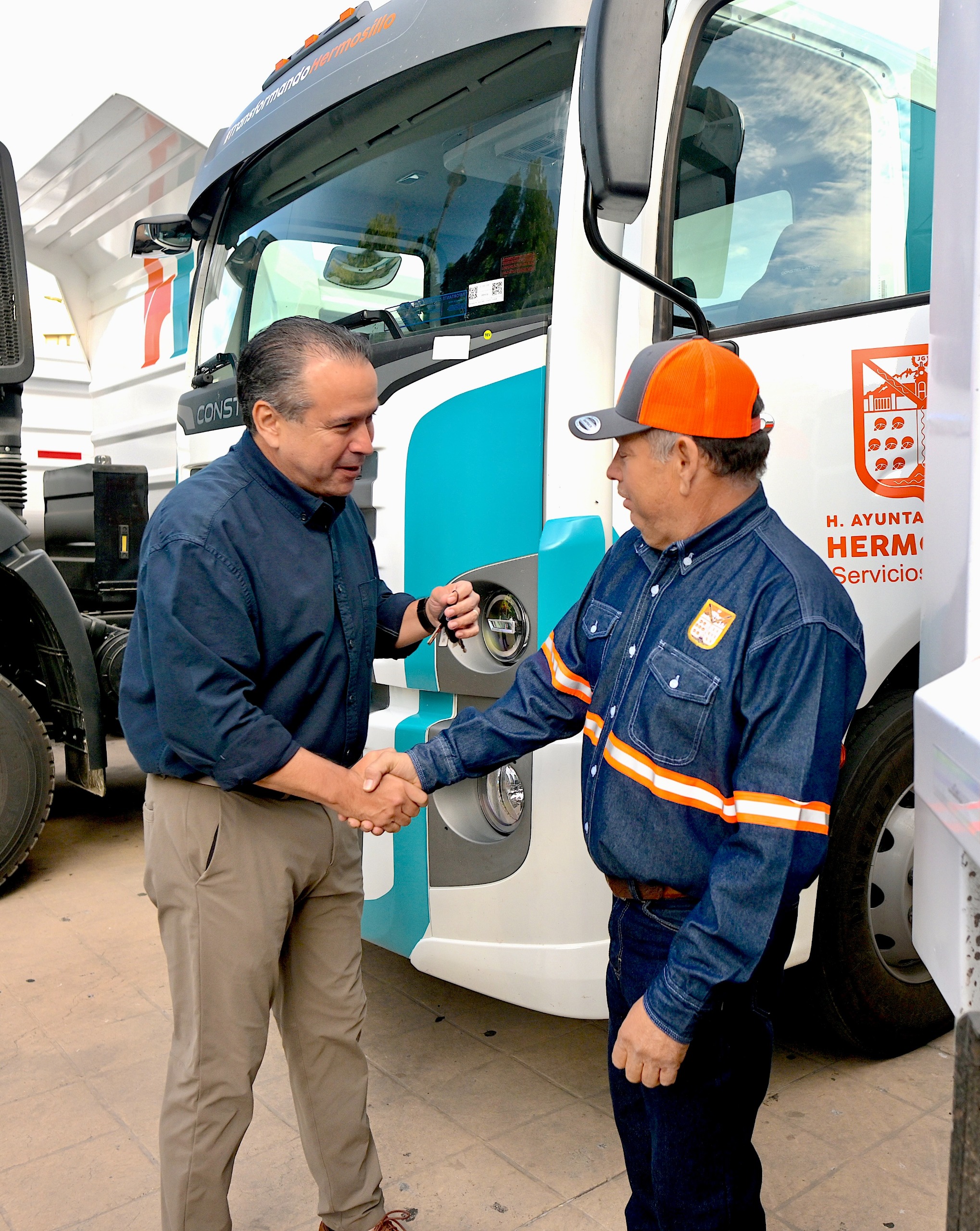 Toño Astiazarán entregó las llaves de las siete nuevas unidades a empleados de Servicios Públicos Municipales acompañado de Ramón Corral Aguirre, Oficial Mayor del Ayuntamiento.