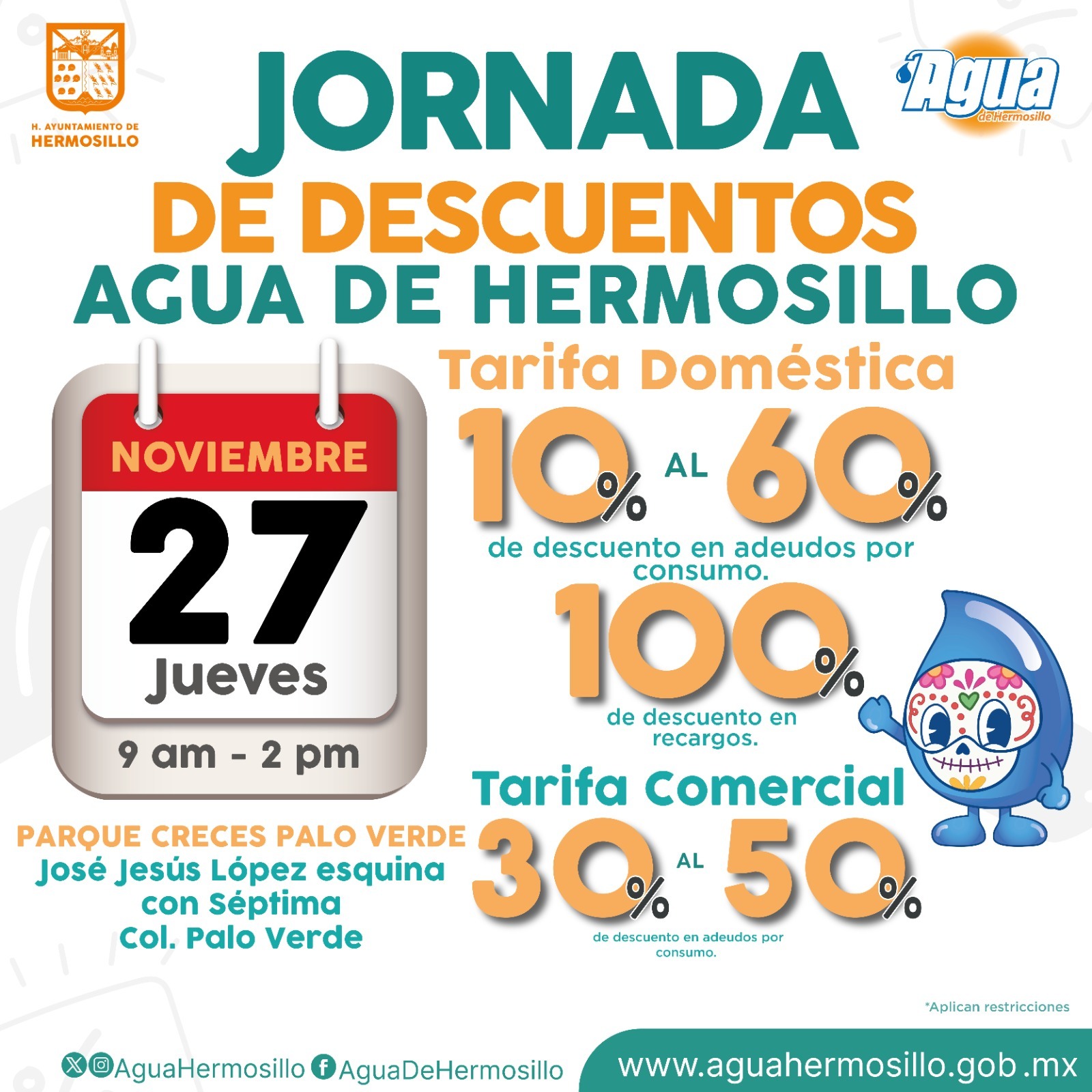 Hermosillo, Sonora; 26 de noviembre, 2025.*.- Este jueves 27 de noviembre, Agua de Hermosillo llevará a cabo una jornada especial de descuentos dirigida a usuarios con adeudos. La atención se ofrecerá de 9:00 a.m. a 2:00 p.m. en el Parque Creces de la colonia Palo Verde, ubicado en calle José Jesús López esquina con Séptima, en la misma colonia.