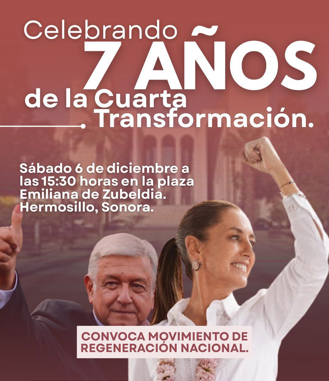 Hermosillo, Sonora, 04 de diciembre de 2025. —El Movimiento de Regeneración Nacional en Sonora convoca a la población de Hermosillo a participar en la concentración “Celebrando 7 años de la Cuarta Transformación”, que se llevará a cabo el sábado 6 de diciembre a las 15:30 horas en la Plaza Emiliana de Zubeldía, en el centro de la ciudad.
