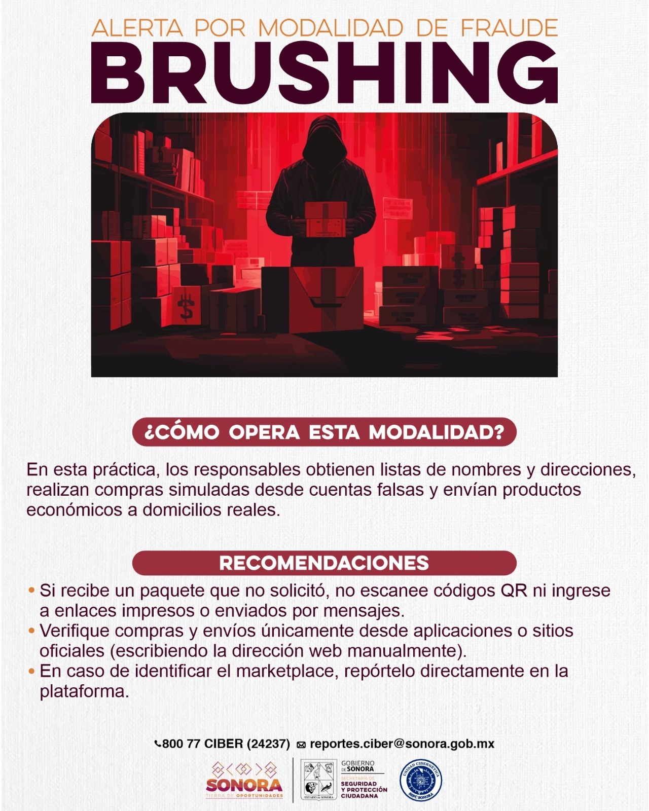 Hermosillo, Sonora; 21 de enero de 2026.- La Secretaría de Seguridad y Protección Ciudadana (SSPC) Sonora a través de la Unidad Cibernética, emite una alerta preventiva a la ciudadanía ante una modalidad de fraude conocida como “Brushing”, la cual consiste en el envío de paquetes no solicitados a domicilios reales utilizando datos personales obtenidos sin el consentimiento de las personas.
