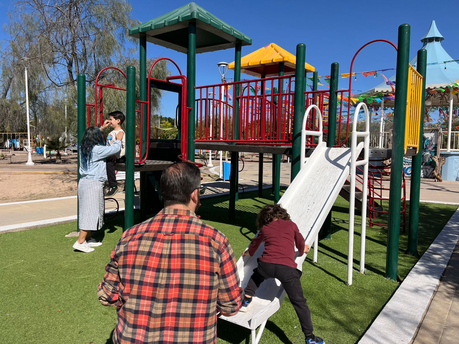 El presidente municipal junto a Astarté Corro Ruiz, titular de la Dirección General de Desarrollo de Infraestructura (DGDI); y Abdón Berrelleza, comisario de Bahía de Kino, encabezó la gira número 29 en la que constató las mejoras a la Plaza, ahora equipada con pasto sintético, punto WiFi, juegos infantiles, bancas, sombrillas, botes de basura, 20 bolardos para mejorar la iluminación y la rehabilitación del kiosco central.