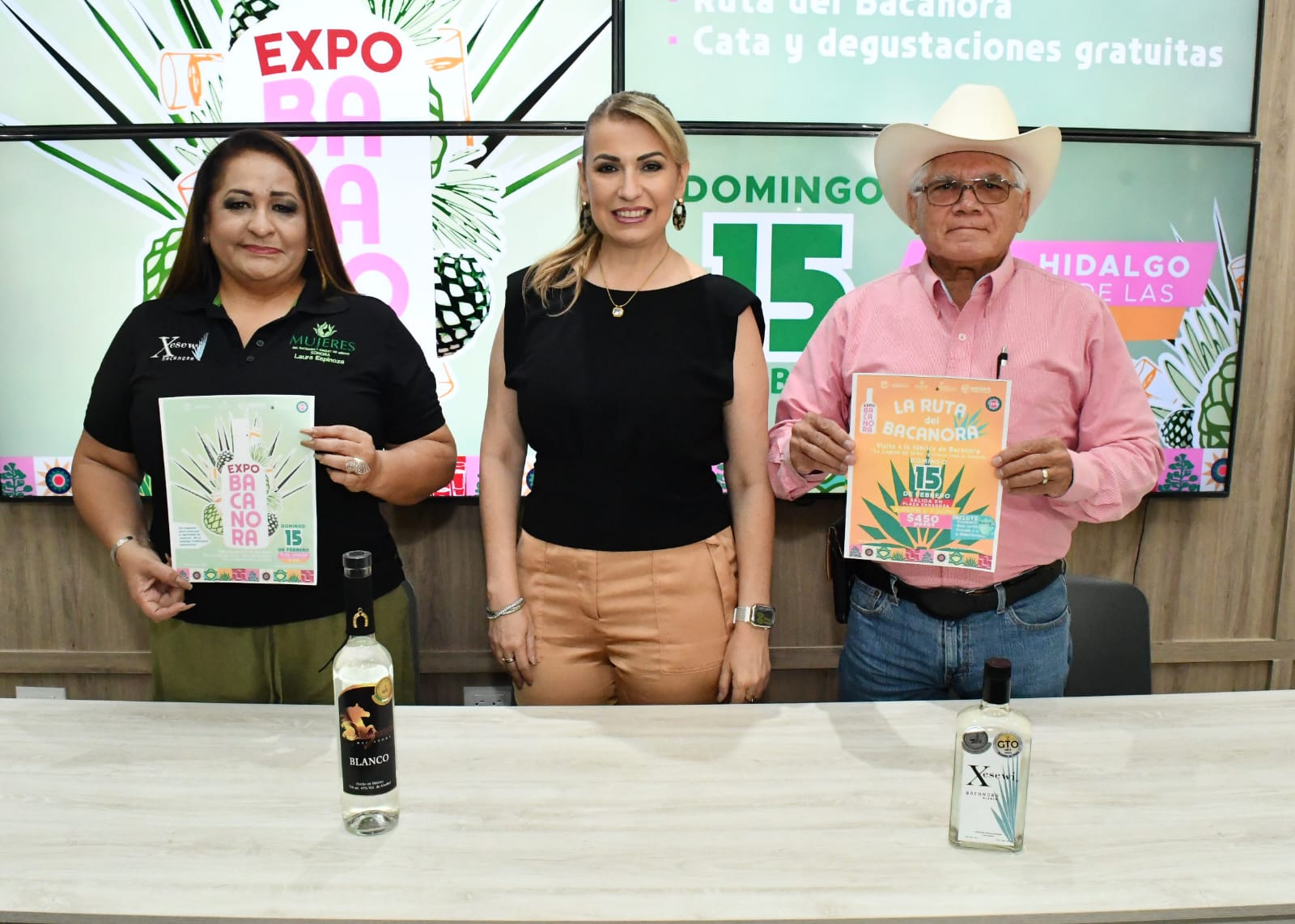 La directora de Desarrollo Turístico de la Agencia Municipal de Desarrollo Económico (AMDE) ofreció detalles del evento acompañada por Laura Espinoza, presidenta de la Asociación de las Mujeres del Bacanora y Maguey de México en Sonora y José Osvaldo Coronado, productor y propietario de la marca Siete Coronados.
