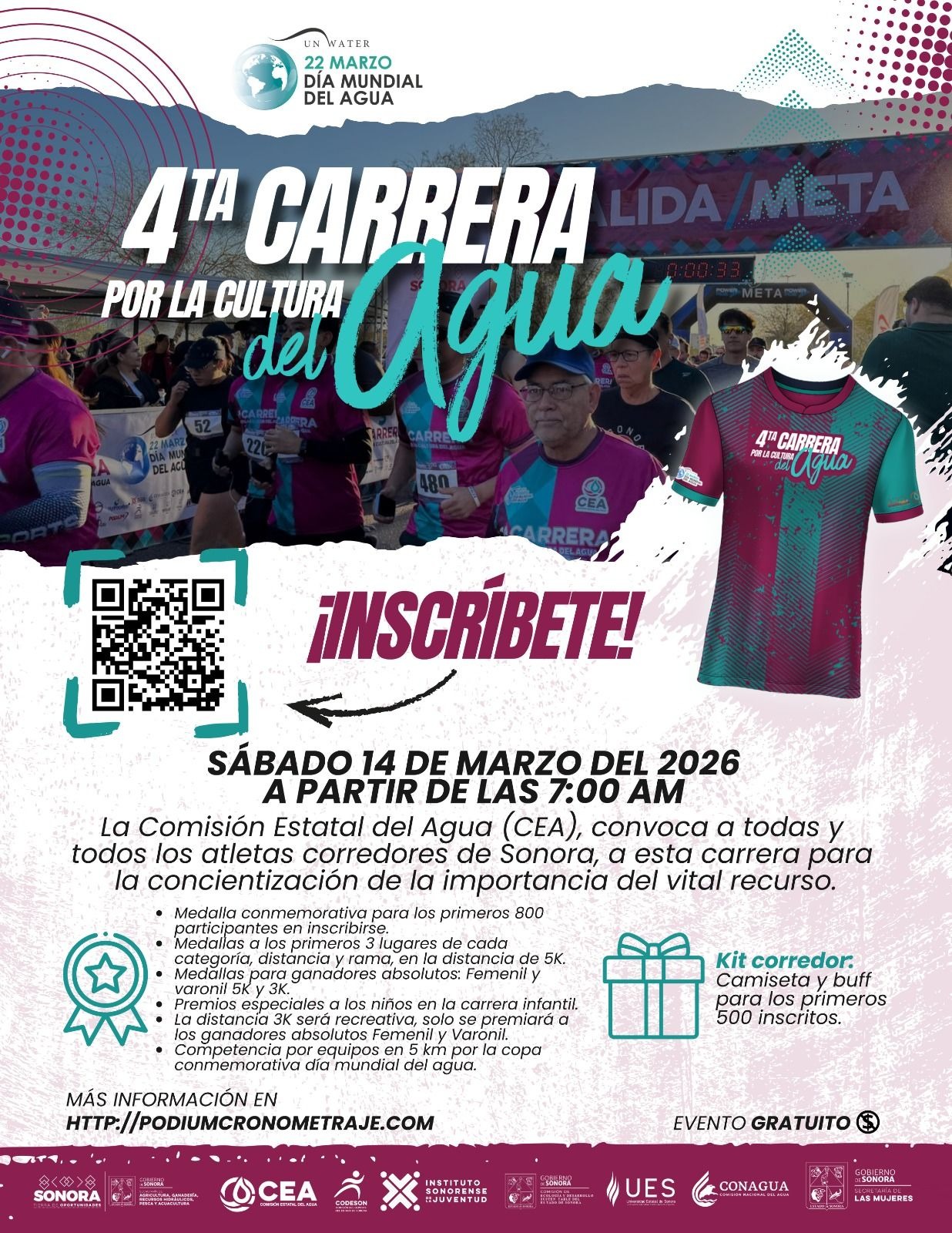 Hermosillo, Sonora; 3 de marzo de 2026.– Para fortalecer la conciencia ciudadana sobre el uso responsable del agua, el Gobierno de Sonora, a través de la Comisión Estatal del Agua (CEA), realizará el próximo 14 de marzo la Carrera por la Cultura del Agua 2026, la cual registra un notable éxito en la inscripción de participantes.