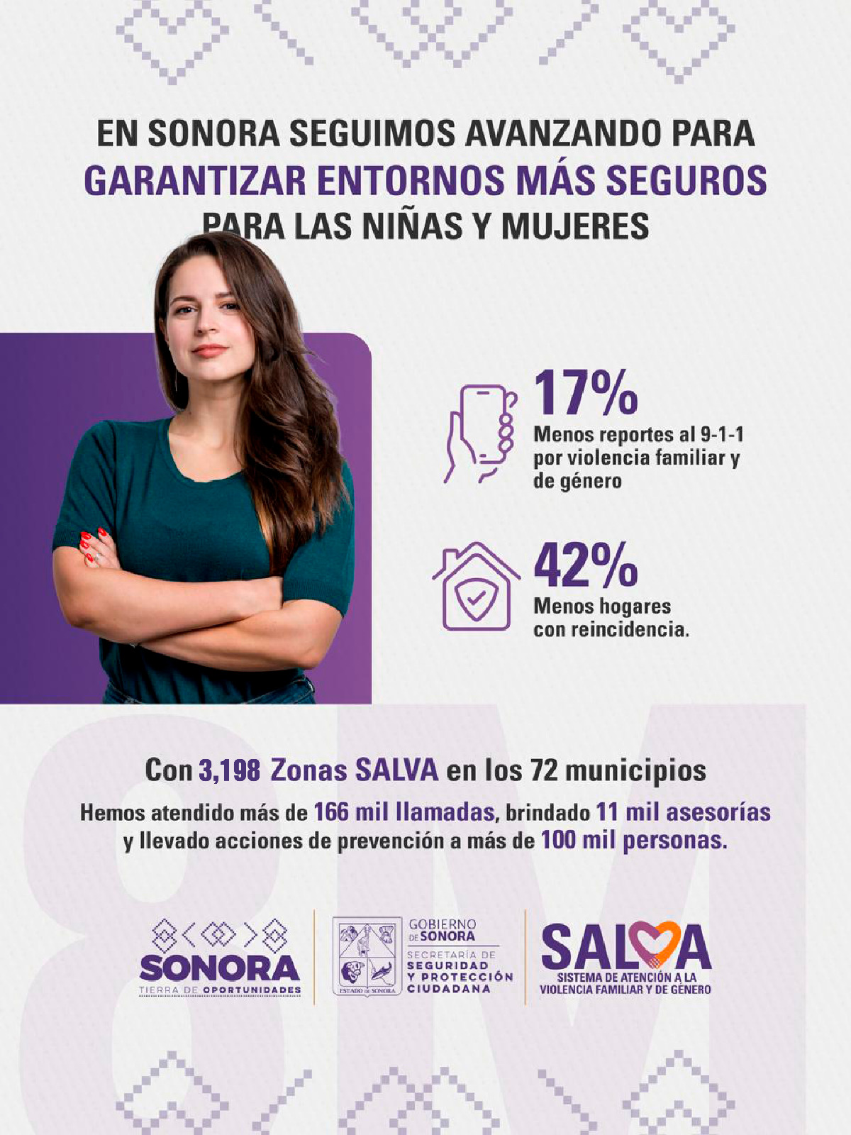 Se han capacitado e instalado más de tres mil 100 Zonas SALVA en 72 municipios del estado, creando espacios seguros y de atención inmediata para mujeres en situación de riesgo. Asimismo, 100 mil 610 personas han sido impactadas a través de capacitaciones en escuelas y colonias, con pláticas enfocadas en la sensibilización y prevención de las violencias.