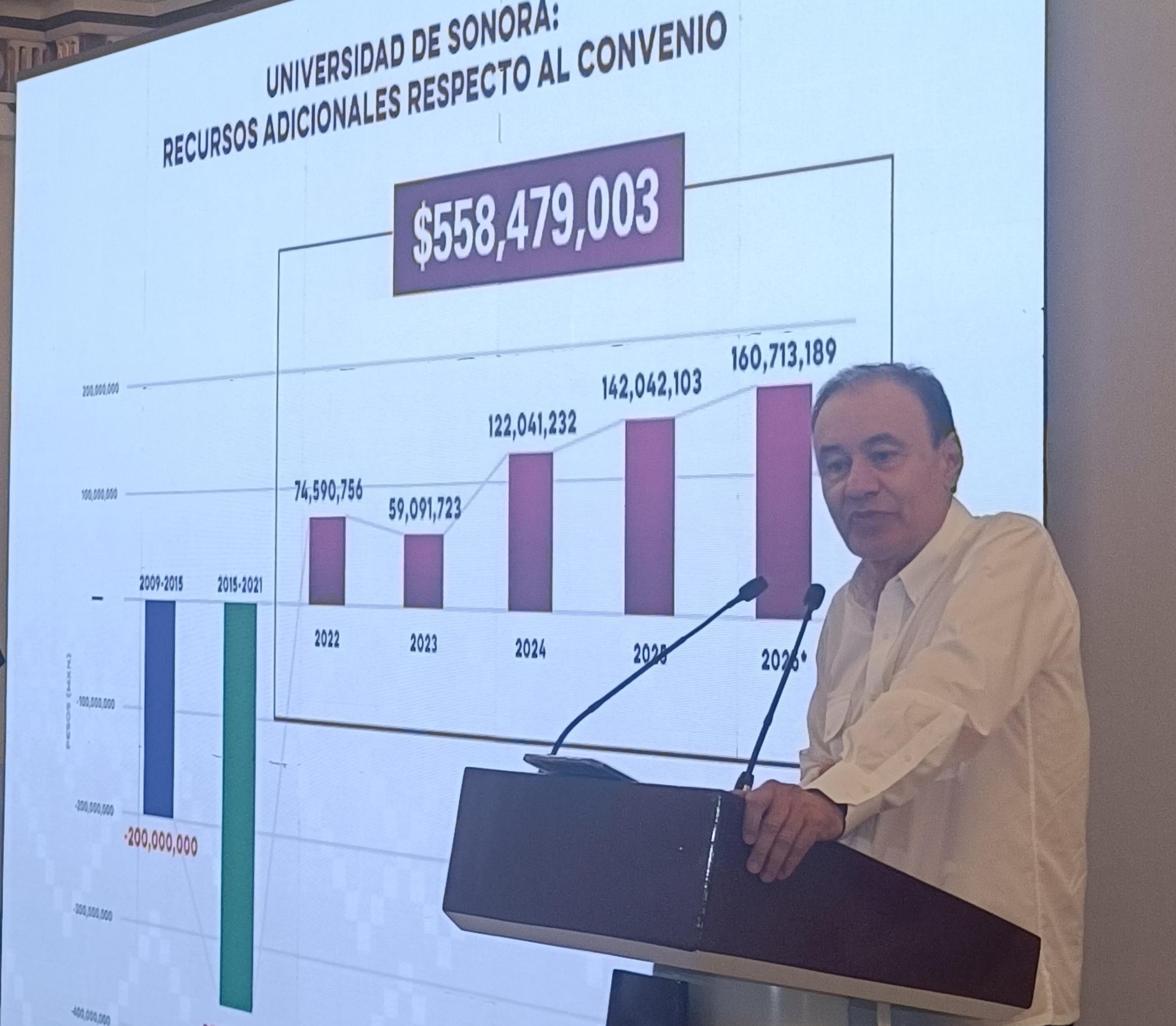 El tema del conflicto en la Universidad de Sonora llegó a la conferencia semanal del gobernador Alfonso Durazo. Allí, con soporte en los fríos números mostró que por el gobierno del estado hubo voluntad y recursos en los últimos cinco años, lapso en el que se han destinado 558 millones de pesos adicionales a la parte que le corresponde (50%) de acuerdo al convenio con la federación, a la que le toca aportar la otra mitad.